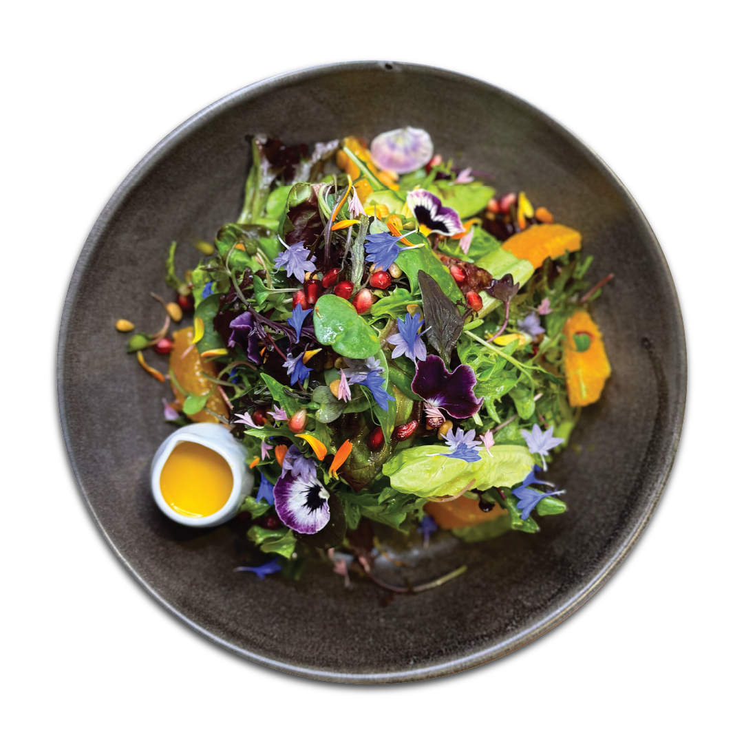 Locally grown selection of leafy greens, complimented with orange wedges, pomegranate, roasted pine nuts and dressed with our house made orange, honey and saffron dressing. (GF,DF,VG)